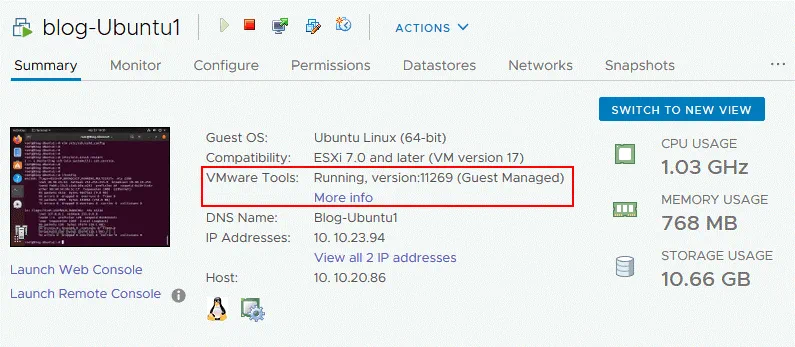 You can see a warning message in the web interface of VMware vSphere Client that VMware Tools are not installed on this virtual machine. If you click Install VMware Tools on this page, a virtual ISO disk that contains the VMware Tools installer will be mounted to the VM.